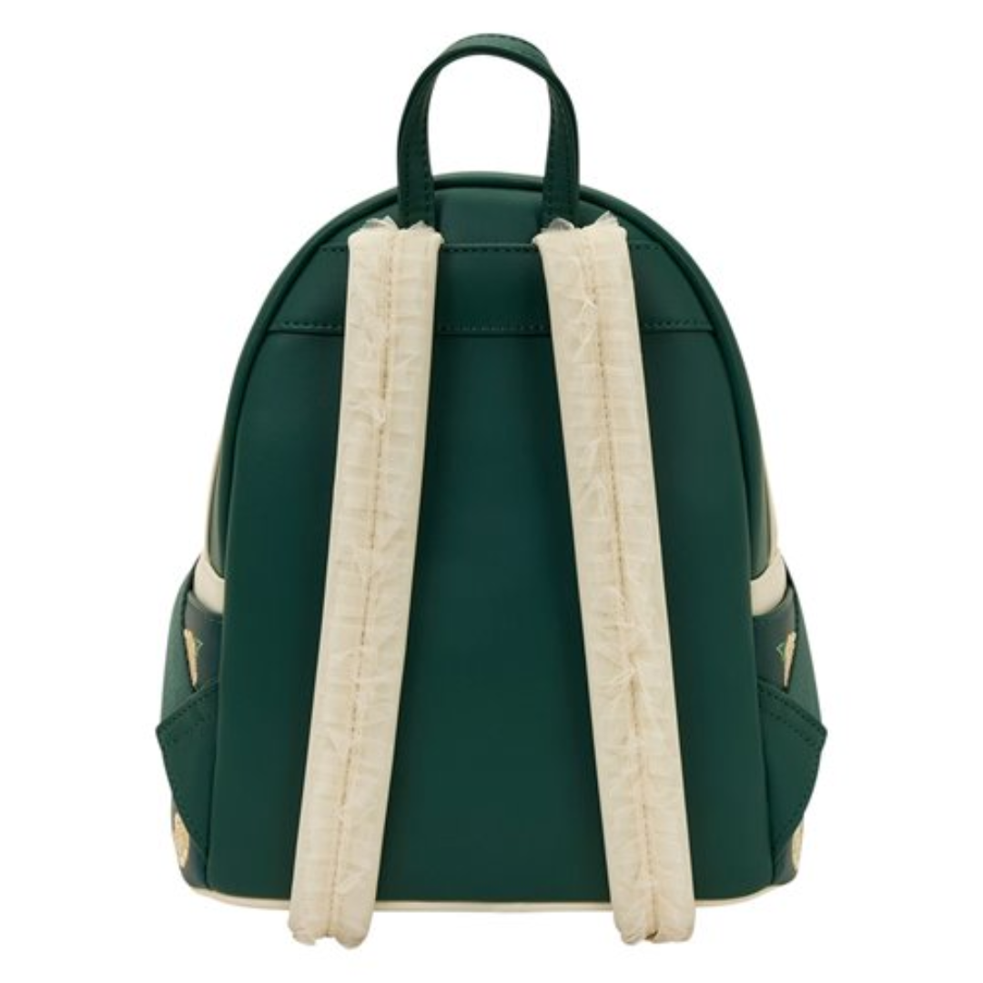 Esta mini mochila inspirada en Bridgerton es puro romance y sofisticación. Su diseño combina delicados estampados florales en todo el frente y laterales, con un encantador detalle central: una silueta enmarcada en un elegante marco dorado que roba todas las miradas. Además, los tirantes con tul le aportan un toque etéreo y distinguido.